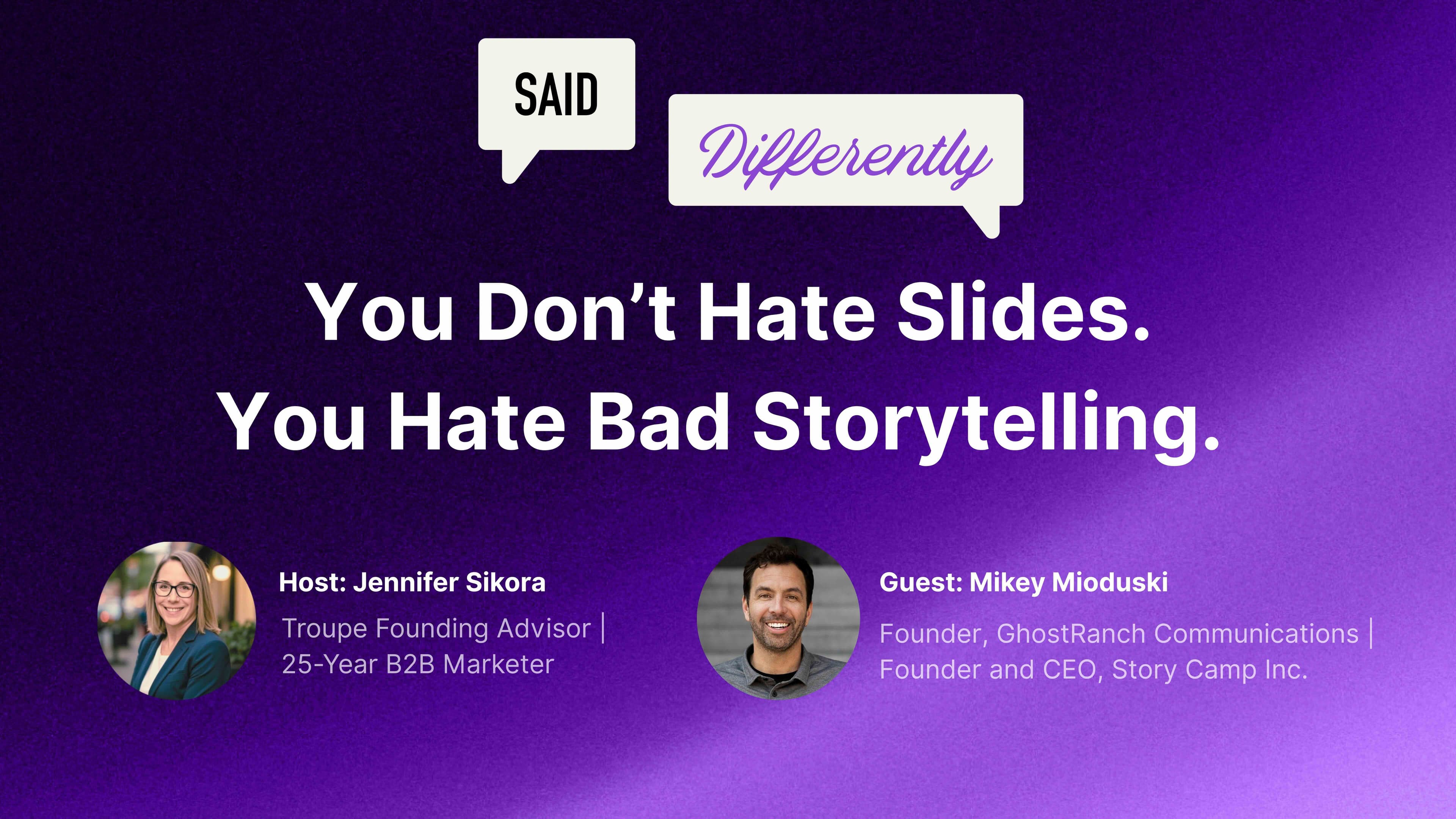 It's a true challenge to convert your messaging guide and go-to-market story into a slide deck that converts sales conversations. It's the hot topic in this episode with GhostRanch Communications' founder Mikey Mioduski.