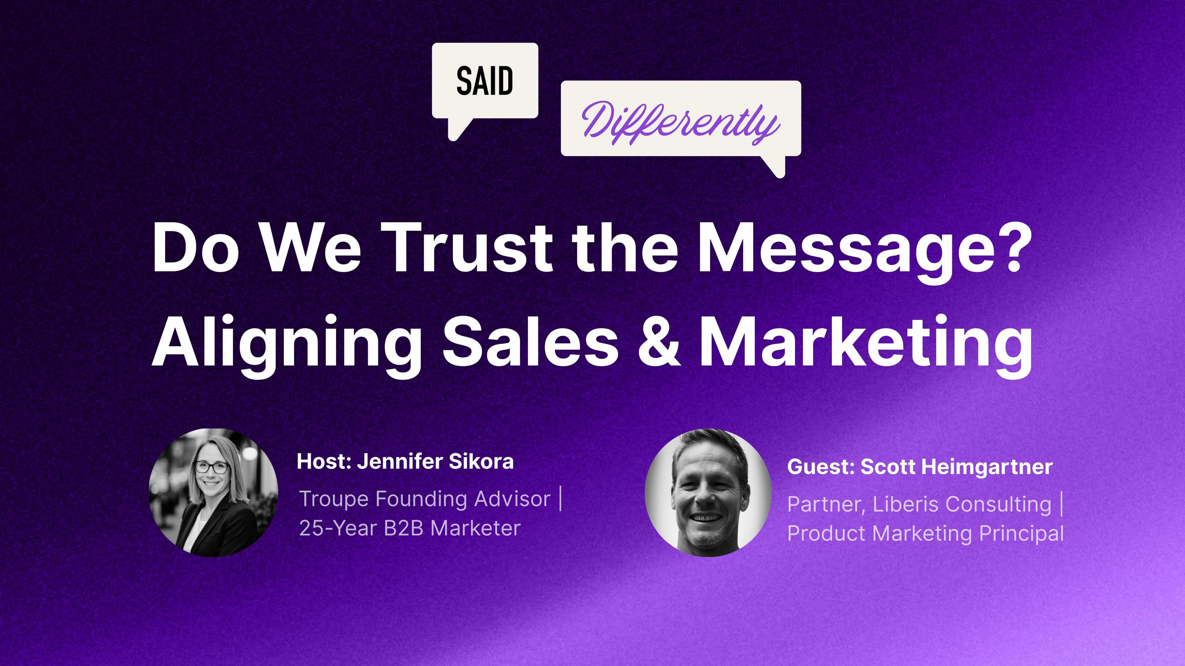 What causes Sales and Marketing to get out-of-step on the message that is delivered to the market? And what problems does that cause for the business? In this episode of Said Differently, Scott Heimgartner -- who is a long-time, in-house B2B tech product marketing leader and later a principal consultant for Liberis Consulting -- joins us to talk about why trust is one of the major root causes of this misalignment, how Product Marketing can bring these GTM teams to a more unified storytelling place.